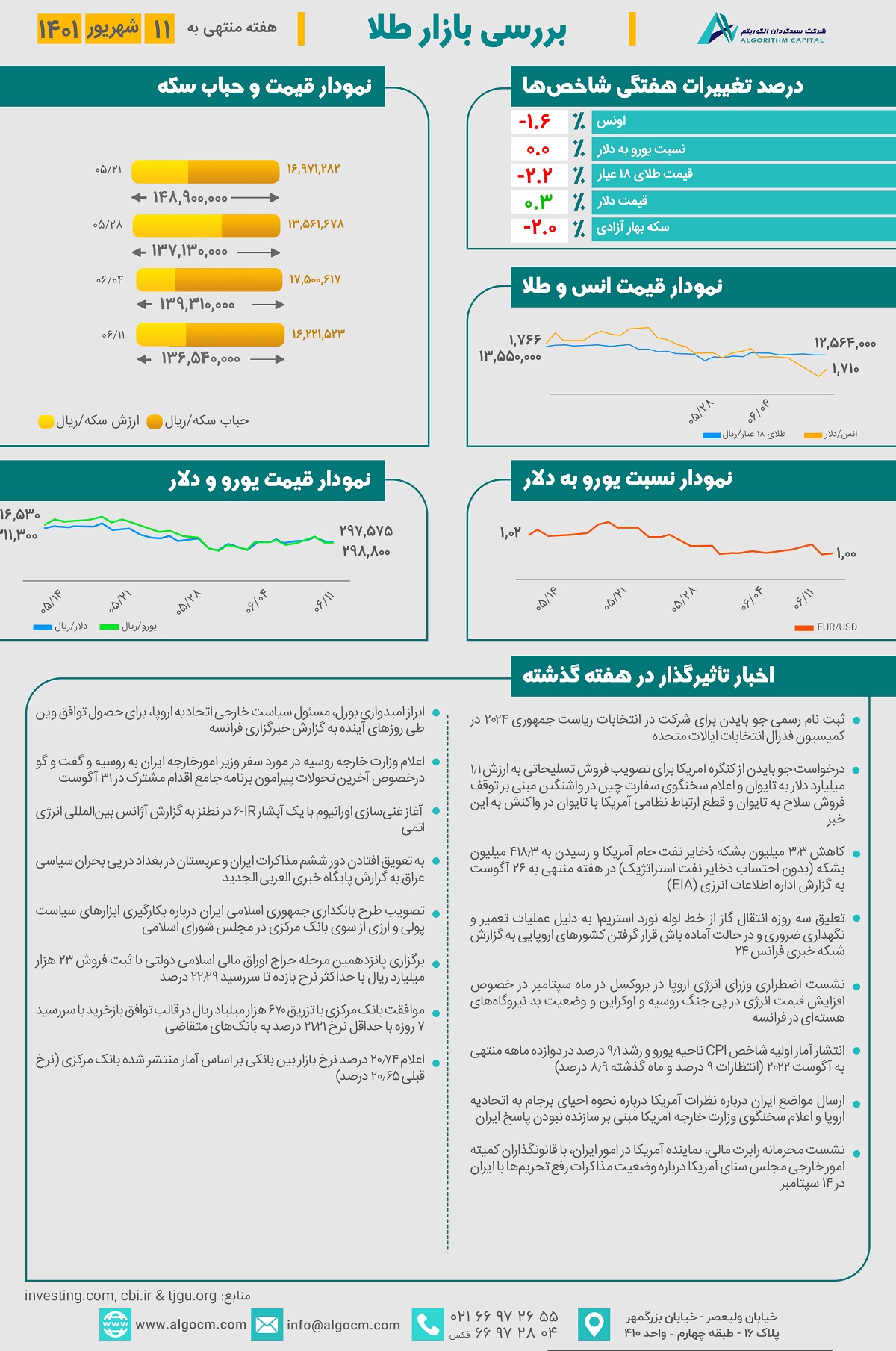 اونس طلا در هفته گذشته با نوسانات نزولی همراه بوده و با کاهش 1.6 درصدی به رقم 1,710 دلار رسید. بازار ارز نیز با توجه به نهایی نشدن نتیجه مذاکرات با افزایش 0.3 درصدی به رقم 298,800 ریال رسید. هر گرم طلای 18 عیار با کاهش 2.2 درصدی به رقم 12,564,000 ریال و سکه بهار آزادی نیز با کاهش 2 درصدی به رقم 136,540,000 ریال رسید. حباب سکه نیز با توجه به کاهش قیمت سکه بهار آزادی، با کاهش 1,280,000 ریالی به رقم 16,220,000 ریال رسید.