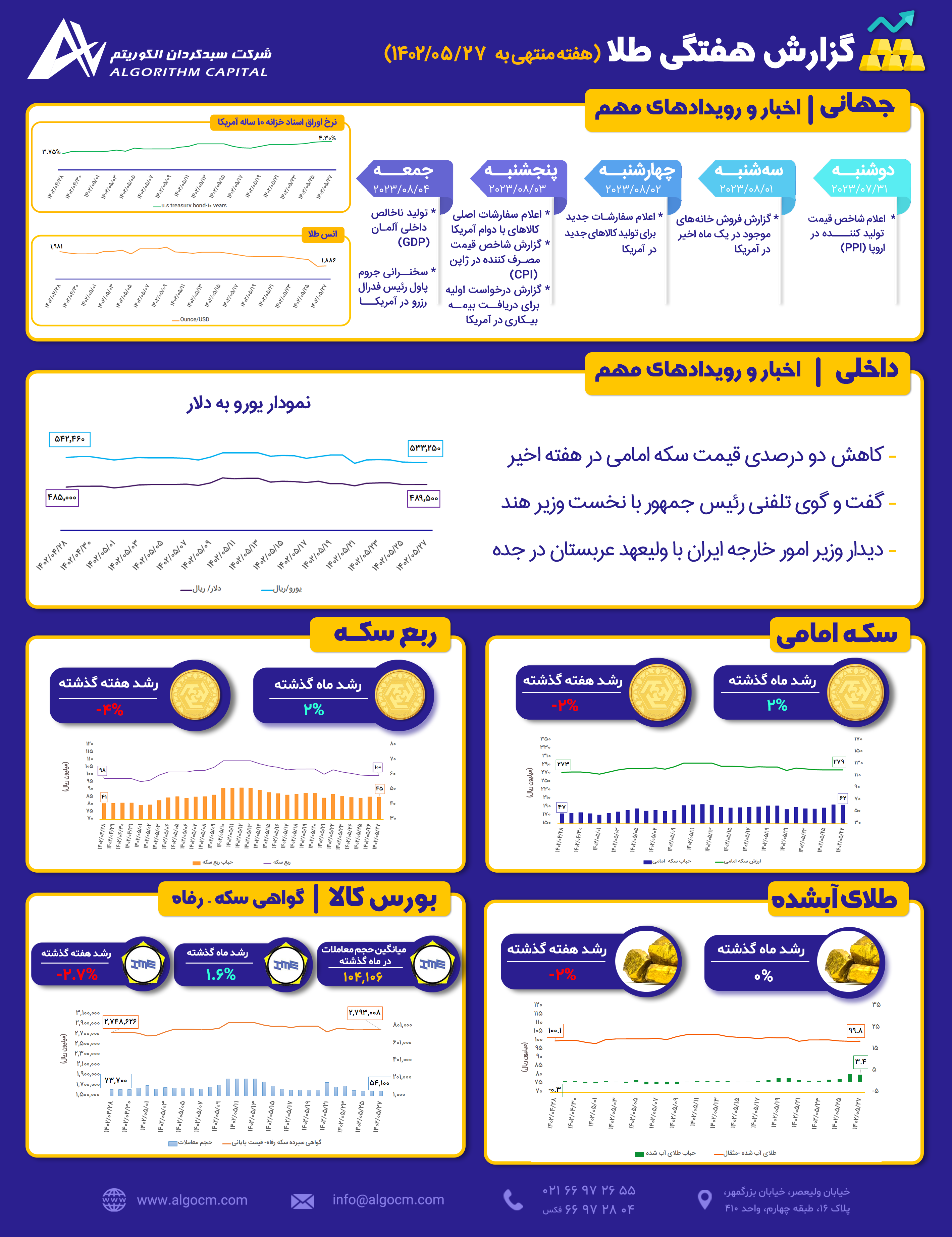 گزارش هفتگی طلا - ۲۷ مرداد ماه ۱۴۰۲ ...کاهش دو درصدی قیمت سکه امامی در هفته اخیر دانلود متن کامل گزارش