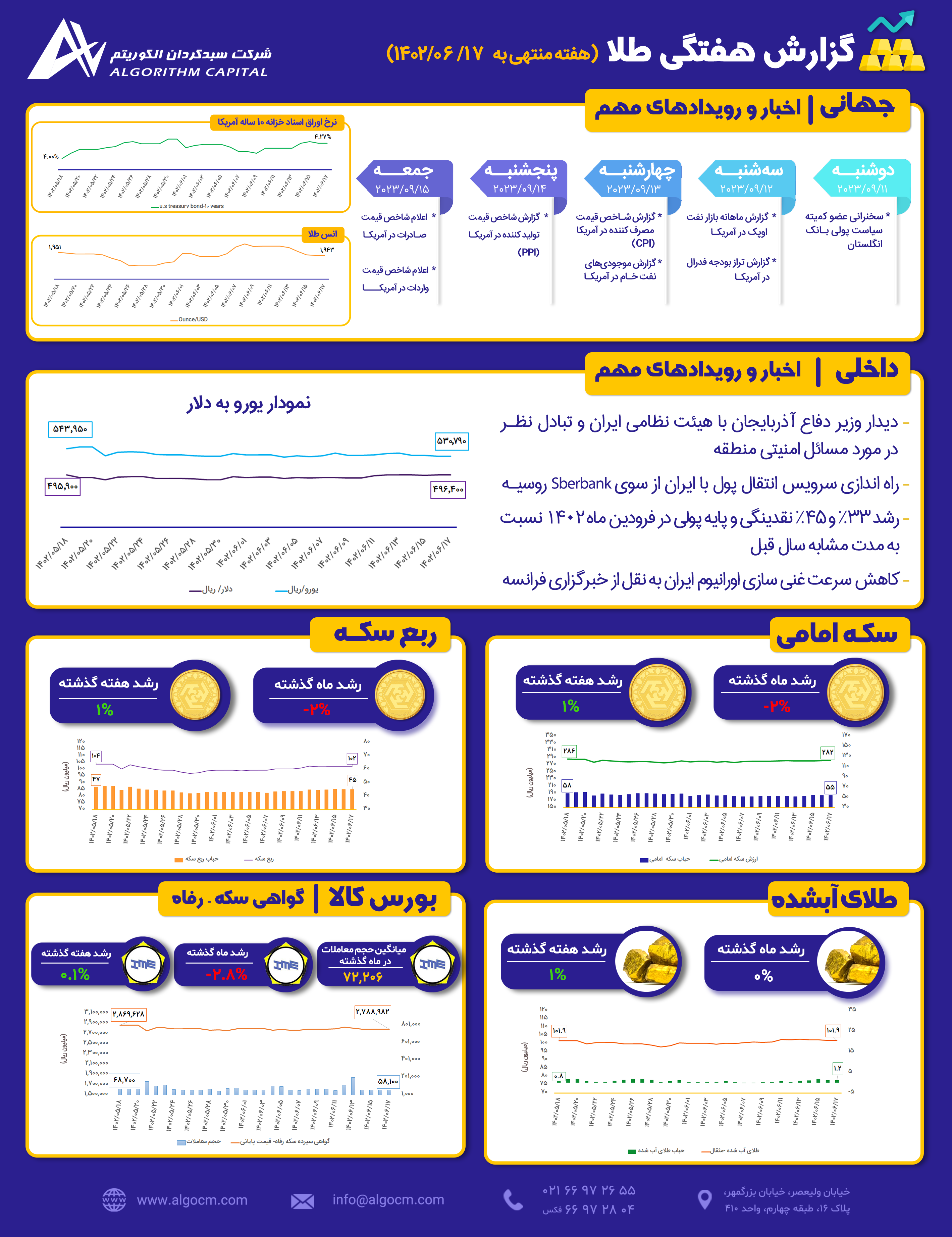 گزارش هفتگی طلا - ۱۷ شهریور ماه ۱۴۰۲ افزایش یک درصدی قیمت سکه امامی در هفته اخیر... دانلود متن کامل گزارش